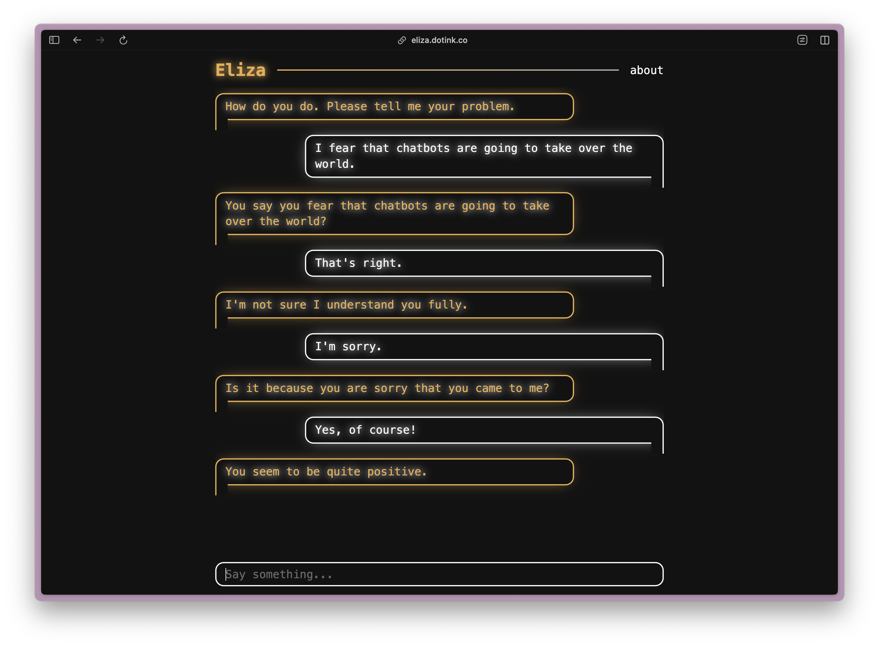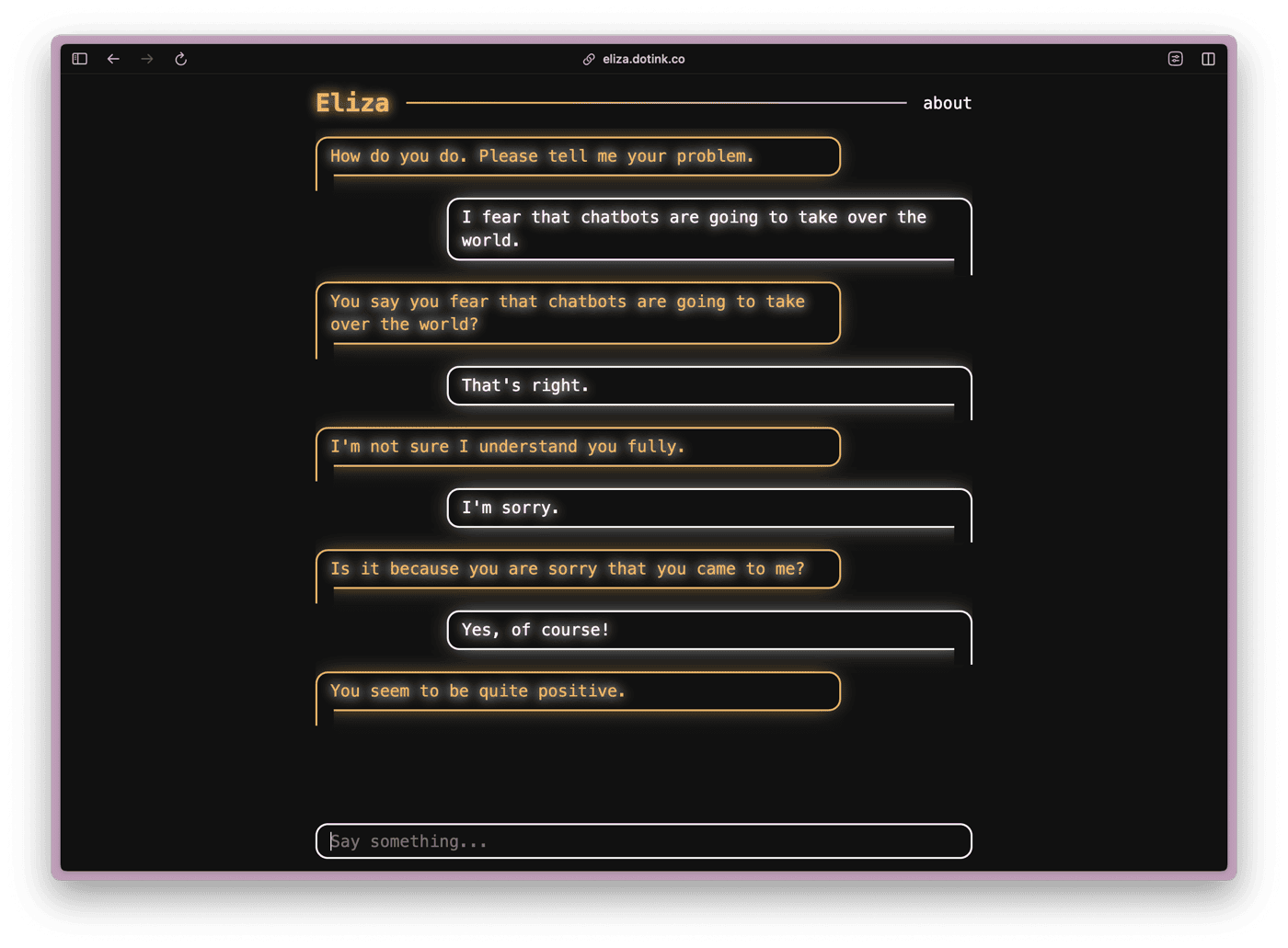 The original ELIZA program was lost, as the tapes storing it degraded. However, in 2021, an original printout of ELIZA’s source code was recovered from Weizenbaum’s archives. A team of researchers used it to faithfully recreate ELIZA, which is now accessible to converse with online.